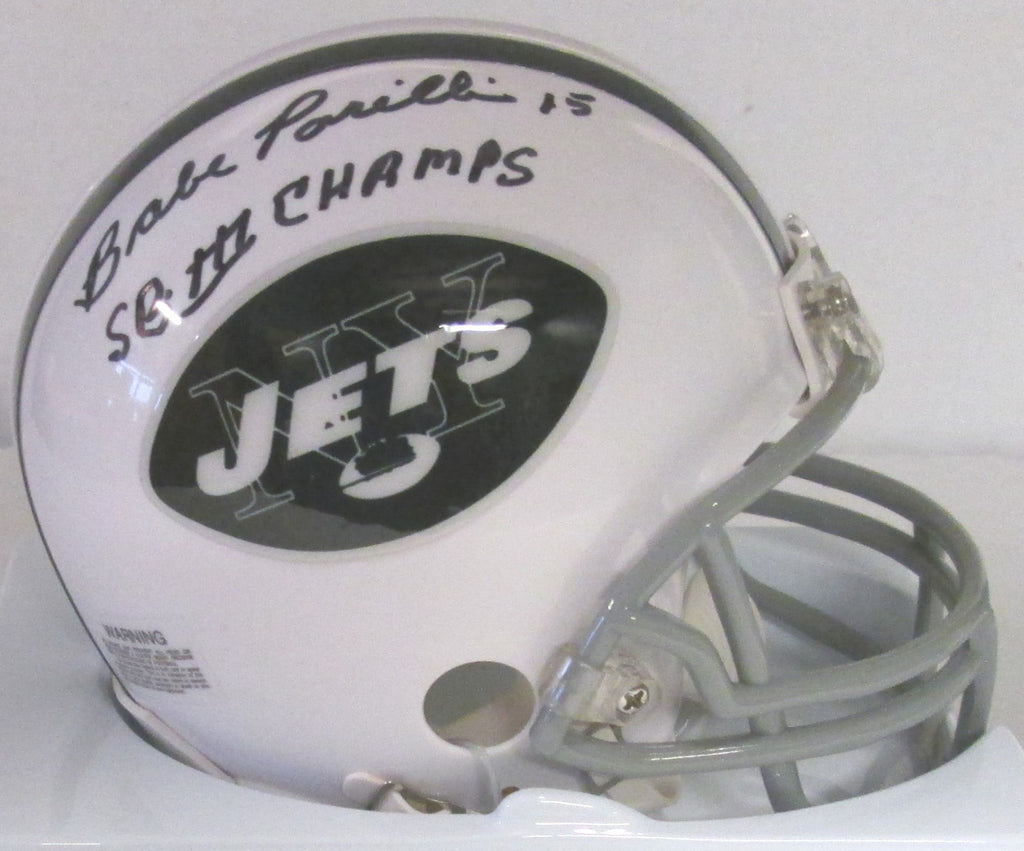 New York Jets Throwback Mini Helmet hand signed by former New York Jets Quarterback BABE PARILLI (deceased). The signature is in Black sharpie and includes the inscription "SB III Champs". PARILLI was a member of the New York Jets Super Bowl III Championship team.. This item was signed at a public signing with us and would make a great addition to any Jets collection! This item is guaranteed to be 100% authentic and will include a COA with our Tamper proof Matching Serial Number Holograms.