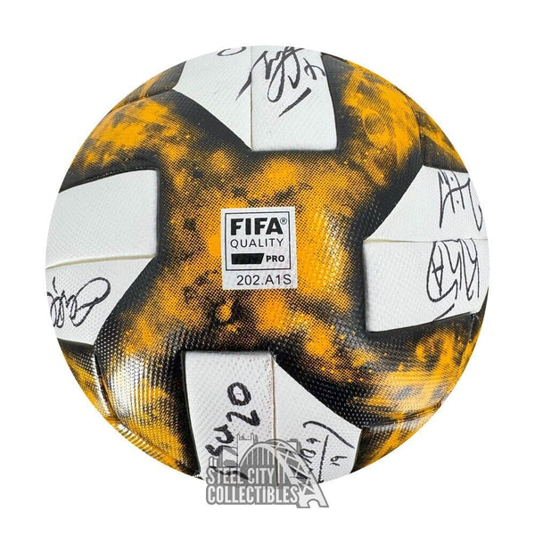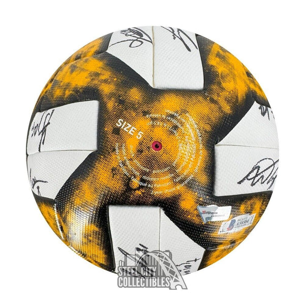 This 2019 Columbus Crew team signed and matched used soccer ball comes authenticated by Beckett and Fanatics. Autographs include. M. Valenzuela, C. Maloney, B. Lundgaard, J. Kempin, A. Crognale, J. Williams.