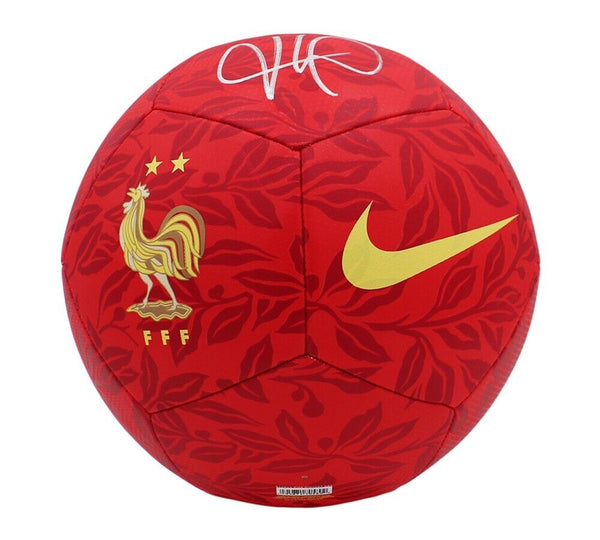 A Red French Federation National Soccer Ball hand signed by Kylian Mbappe. The item and signature are in excellent condition. Mbappe is a French professional soccer player widely regarded as one of the best players in the world. Known for his blistering speed, technical skill, and clinical finishing, he burst onto the global scene at the 2018 FIFA World Cup, where he helped lead France to victory and became the tournament's standout young player. Mbappe has won multiple Ligue 1 titles with Paris Saint-Germain (PSG) and has been a key figure in both club and international competitions. AUTHENTICATION: The item is accompanied by a Panini Certificate of Authenticity - Panini Serial Numbered and Databased Hologram