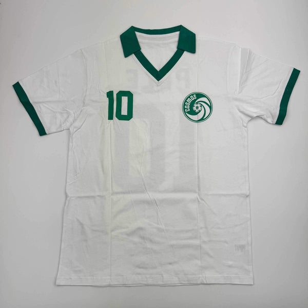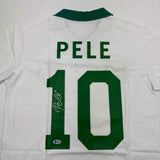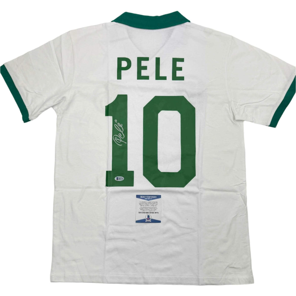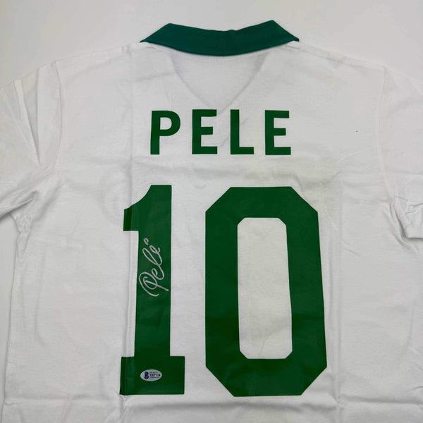 Autographed/Signed Pele New York Cosmos White Soccer Futbol Jersey Beckett COA Jersey has no brand names or logos. This is a custom jersey and was not manufactured by or in any manner associated with any professional sports league or manufacturer. This custom jersey carries no professional sports league designation. The item is intended to be an autographed collectible. The custom jersey displays the name and number of the player. This item in no way is affiliated with or connected to any professional sports organization. Size is XL.