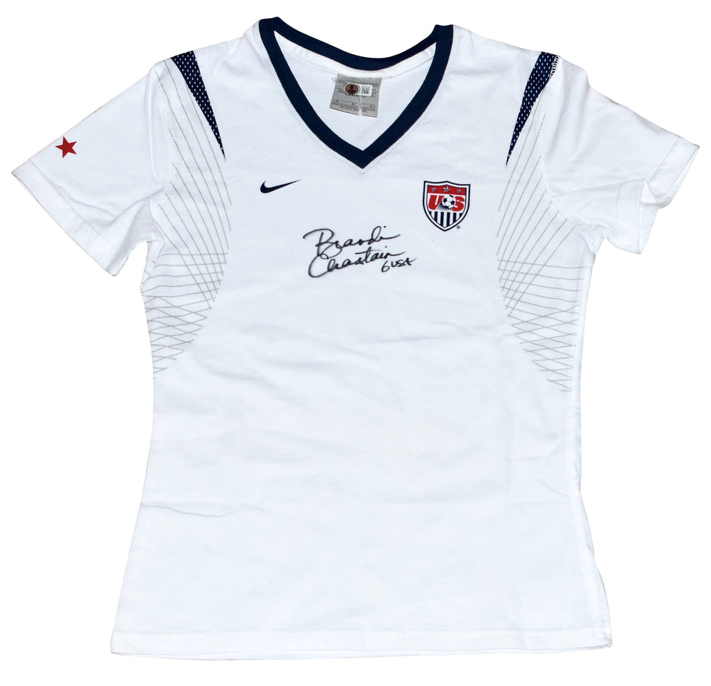 Brandi Chastain, one of the greatest women's soccer players of all-time, has hand signed this Team USA Nike soccer jersey at a private signing. This item is authenticated by Beckett Authentication Services and was signed in the presence of one of their representatives. Their tamper-evident hologram featuring a QR code and serial number is on the item. The authenticity can be verified online by entering the serial number or scanning the QR code.Item pictured may not be the exact item you will receive. It will be similar quality, and we guarantee your satisfaction.