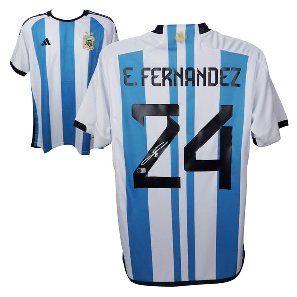 This is a Enzo Fernandez Signed Argentina Soccer Jersey #24 with Beckett Witness. THE ITEM IN THE PICTURE IS A STOCK IMAGE. YOU WILL RECEIVE AN IDENTICAL ITEM OF EQUAL QUALITY. ALL JERSEYS ARE SIZE LARGE. Every item of signed memorabilia we sell is official and of the highest quality. We pride ourselves on providing sports fans with the most exclusive signed memorabilia on the market. We are an industry leading signed memorabilia company who can guarantee 100% authenticity on every signature we sell. The item you receive will be identical to the one you are seeing in the stock pictures. This includes the item, the authentication company, signature color and signature placement. We take pride in ensuring the authenticity of all our items. With unwavering commitment, we guarantee that every signature is 100% authentic. Every item of signed memorabilia comes with a scannable barcode which takes you to the certificate of authenticity on the company's website. These industry leading authentication companies include Beckett Authentication Services, James Spencer Authentication Services and Professional Sports Authentication Services.