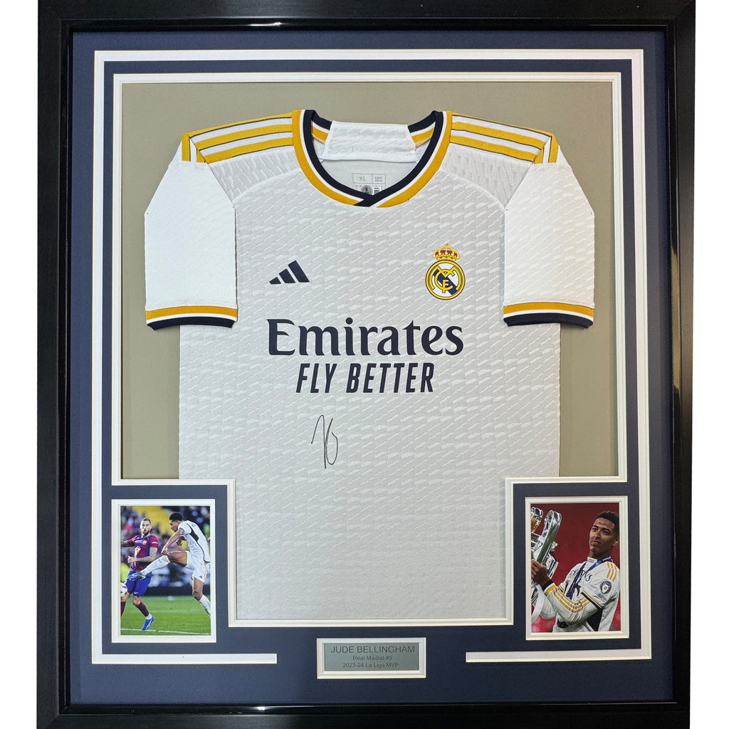 Framed Autographed/Signed Jude Bellingham 35x39 Real Madrid Jersey Beckett COA The item is professionally framed and matted with two 5x7 photos, measures 35x39 inches and is ready to be hung in your man cave! Photo and matting requests can be made.