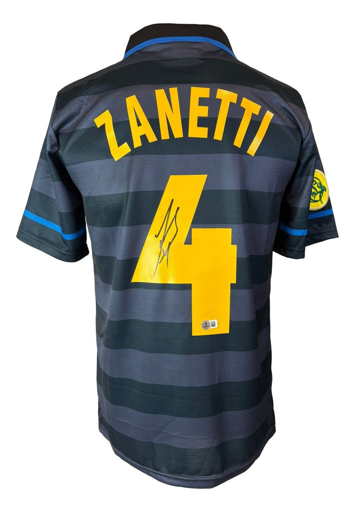 Featured is a Javier Zanetti signed Inter Milan Umbro soccer jersey. This jersey has been hand signed by Zanetti and comes with the Beckett hologram and certificate of authenticity. Jersey size may vary. This jersey would make a great addition to any sports memorabilia collection!. SPECIFICATIONS Autographed By: Javier Zanetti Team: Inter Milan Sport: Soccer Authentication: Beckett Grading Services