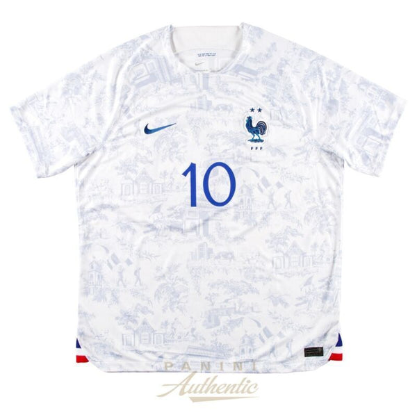 Is a 2022 France National Team white alternate replica jersey autographed by Kylian Mbappe. This jersey is brand new in the original Panini packaging.This jersey includes a Panini Authentic certificate of authenticity with a unique hologram number that corresponds to the hologram on the actual jersey. These holograms protect the integrity of the product and serve to guarantee the authenticity of the signature it bears. MONEY BACK GUARANTEE! If for any reason you are not completely satisfied with the quality or authenticity of your purchase, we will gladly give you a full refund or exchange, whichever you prefer up to 30 days after purchase. Please feel free to e-mail us with any questions. Thank you. Authenticator Pre-Certified Authenticator: Panini Authenticated History of item: Kylian Mbappe has signed this item in the presence of a representative from Panini Authenticated. Describe how you came to possess this item: Super Sports Center is a fully authorized dealer for Upper Deck Authenticated as well as Panini Authenticated, Mounted Memories and Steiner Sports. Other information about you and / or the item: Super Sports Center strives to deliver the most authentic in sports memorabilia from trusted companies like Mounted Memories, Steiner Sports and Upper Deck Authenticated. If it exists, we can find it for you!