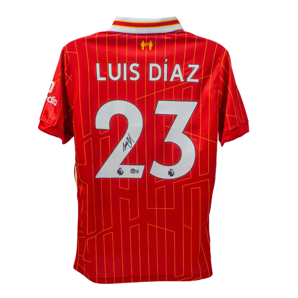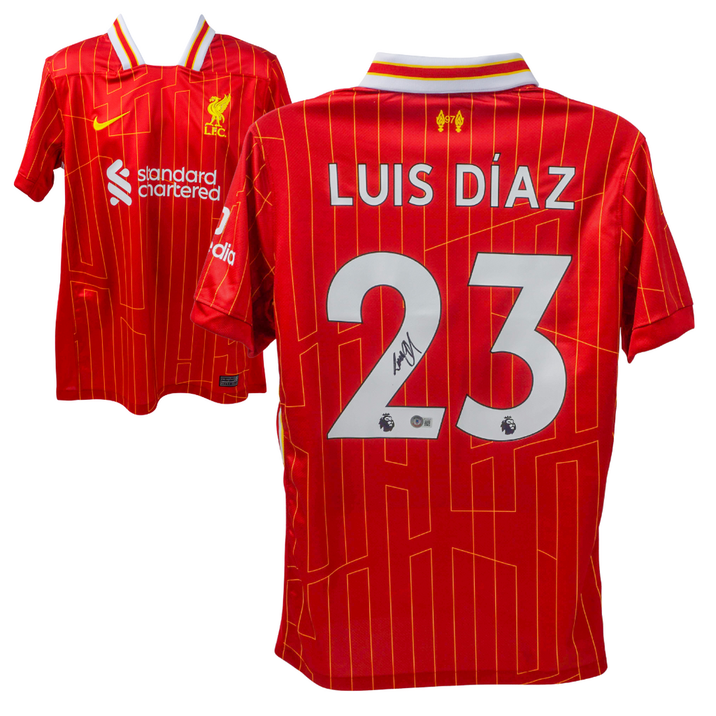 This is a Luis Diaz Signed Liverpool FC Home Soccer Jersey #23 with Beckett COA. THE ITEM IN THE PICTURE IS A STOCK IMAGE. YOU WILL RECEIVE AN IDENTICAL ITEM OF EQUAL QUALITY. ALL JERSEYS ARE SIZE LARGE. Every item of signed memorabilia we sell is official and of the highest quality. We pride ourselves on providing sports fans with the most exclusive signed memorabilia on the market. We are an industry leading signed memorabilia company who can guarantee 100% authenticity on every signature we sell. The item you receive will be identical to the one you are seeing in the stock pictures. This includes the item, the authentication company, signature color and signature placement. We take pride in ensuring the authenticity of all our items. With unwavering commitment, we guarantee that every signature is 100% authentic. Every item of signed memorabilia comes with a scannable barcode which takes you to the certificate of authenticity on the company's website. These industry leading authentication companies include Beckett Authentication Services, James Spencer Authentication Services and Professional Sports Authentication Services.