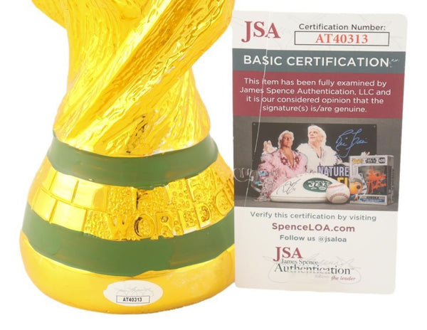 Featured is a Mario Kempes signed 15" replica world soccer championship trophy. This trophy has been hand signed by Kempes and comes with the JSA hologram and certificate of authenticity. This trophy would make a great addition to any sports memorabilia collection! SPECIFICATIONS Autographed By: Mario Kempes Team: Argentina Sport: Soccer Authentication: James Spence Authentication (JSA)