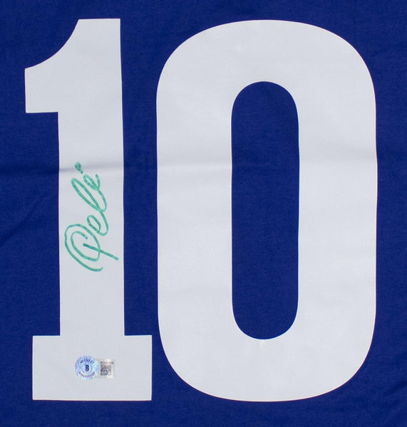 Custom on-field style jersey with everything pressed on, size Adult Large. Hand-signed by Pele (D. 2022, HOF).The autograph includes an official Beckett Authentication Services serially numbered hologram and QR Code card for authenticity purposes.Authentication: Beckett Hologram with QR Code card