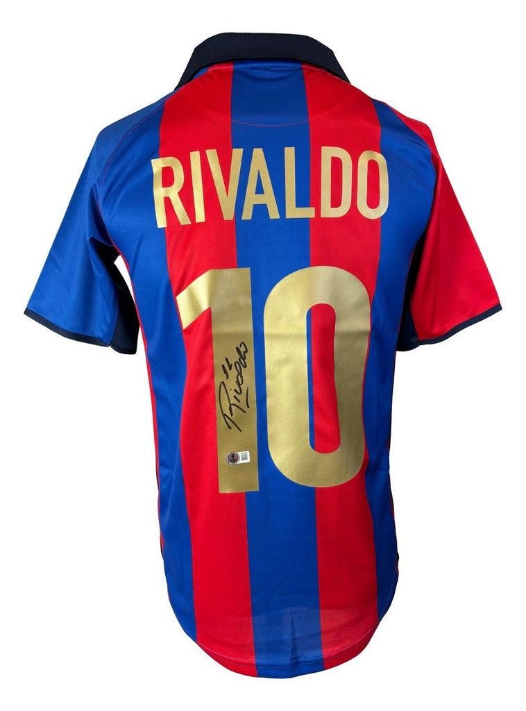 Featured is a Rivaldo signed Barcelona Nike soccer jersey. This jersey was hand signed by Rivaldo and comes with the Beckett hologram and certificate of authenticity. Jersey size may vary. This jersey would make a great addition to any sports memorabilia collection! SPECIFICATIONS Autographed By: Rivaldo Team: Barcelona Sport: Soccer Authentication: