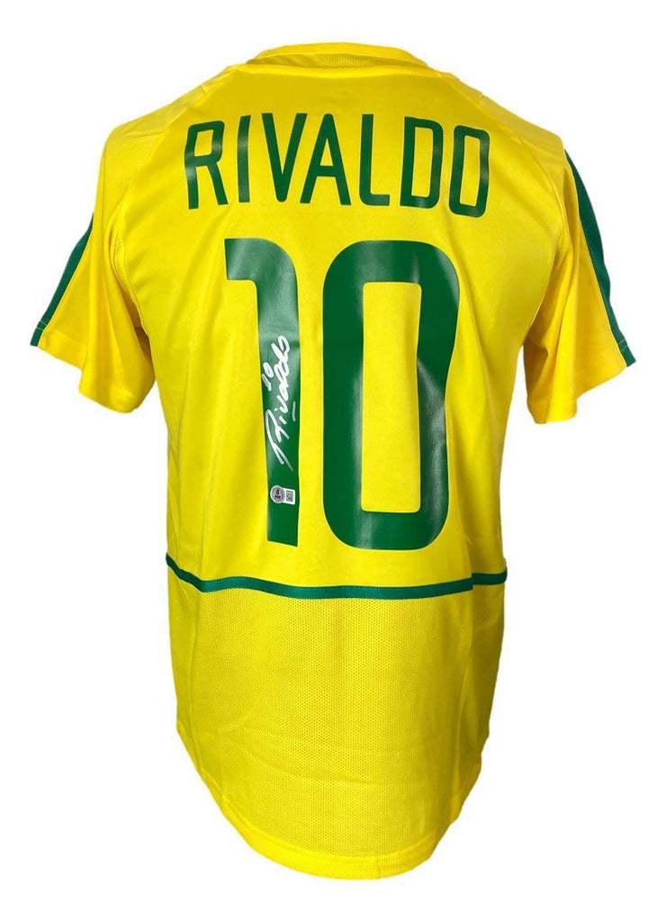 Featured is a Rivaldo signed Brazil Nike soccer jersey. This jersey was hand signed by Rivaldo and comes with the Beckett hologram and certificate of authenticity. This jersey is size M. This jersey would make a great addition to any sports memorabilia collection! SPECIFICATIONS Autographed By: Rivaldo Team: Brazil Sport: Soccer Authentication: