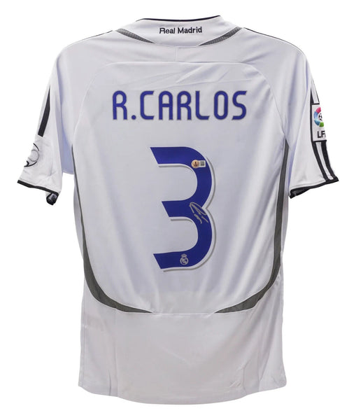 This is a Roberto Carlos Signed Real Madrid FC Home Soccer Jersey #3 with Beckett Witness. THE ITEM IN THE PICTURE IS A STOCK IMAGE. YOU WILL RECEIVE AN IDENTICAL ITEM OF EQUAL QUALITY. ALL JERSEYS ARE SIZE LARGE. Every item of signed memorabilia we sell is official and of the highest quality. We pride ourselves on providing sports fans with the most exclusive signed memorabilia on the market. We are an industry leading signed memorabilia company who can guarantee 100% authenticity on every signature we sell. The item you receive will be identical to the one you are seeing in the stock pictures. This includes the item, the authentication company, signature color and signature placement. We take pride in ensuring the authenticity of all our items. With unwavering commitment, we guarantee that every signature is 100% authentic. Every item of signed memorabilia comes with a scannable barcode which takes you to the certificate of authenticity on the company's website. These industry leading authentication companies include Beckett Authentication Services, James Spencer Authentication Services and Professional Sports Authentication Services.