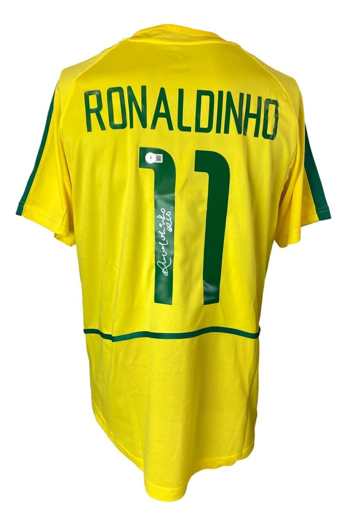 Featured is a Ronaldinho signed Brazil Nike soccer jersey, inscribed "R10". This jersey has been hand signed by Ronaldinho and comes with the Beckett hologram and certificate of authenticity. This jersey is size XL. This jersey would make a great addition to any sports memorabilia collection! SPECIFICATIONS Autographed By: Ronaldinho Team: FC Barcelona Sport: Soccer Authentication: Beckett Grading Services
