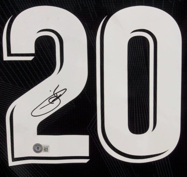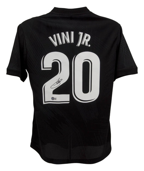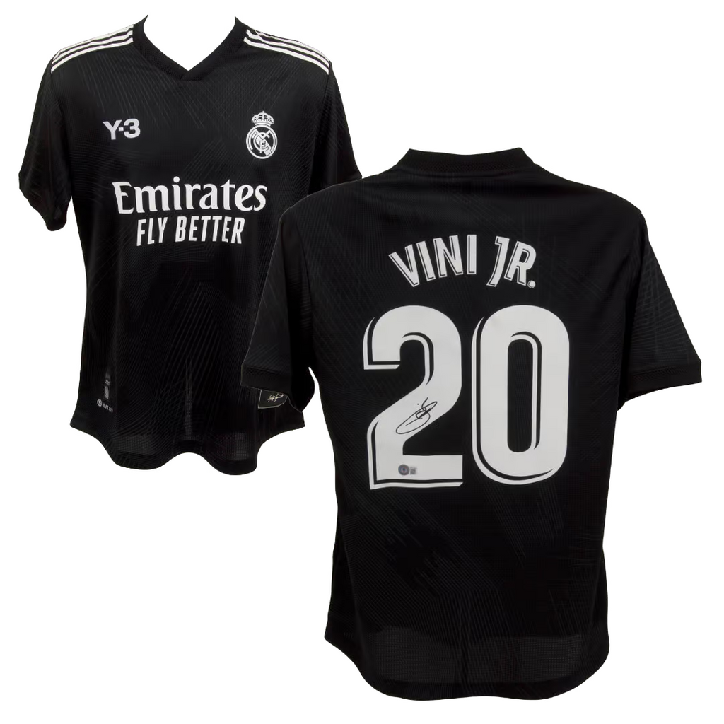This is a Vinicius Jr Signed Real Madrid Away Y-3 Soccer Jersey #20 with Beckett COA. THE ITEM IN THE PICTURE IS A STOCK IMAGE. YOU WILL RECEIVE AN IDENTICAL ITEM OF EQUAL QUALITY. ALL JERSEYS ARE SIZE LARGE. Every item of signed memorabilia we sell is official and of the highest quality. We pride ourselves on providing sports fans with the most exclusive signed memorabilia on the market. We are an industry leading signed memorabilia company who can guarantee 100% authenticity on every signature we sell. The item you receive will be identical to the one you are seeing in the stock pictures. This includes the item, the authentication company, signature color and signature placement. We take pride in ensuring the authenticity of all our items. With unwavering commitment, we guarantee that every signature is 100% authentic. Every item of signed memorabilia comes with a scannable barcode which takes you to the certificate of authenticity on the company's website. These industry leading authentication companies include Beckett Authentication Services, James Spencer Authentication Services and Professional Sports Authentication Services.