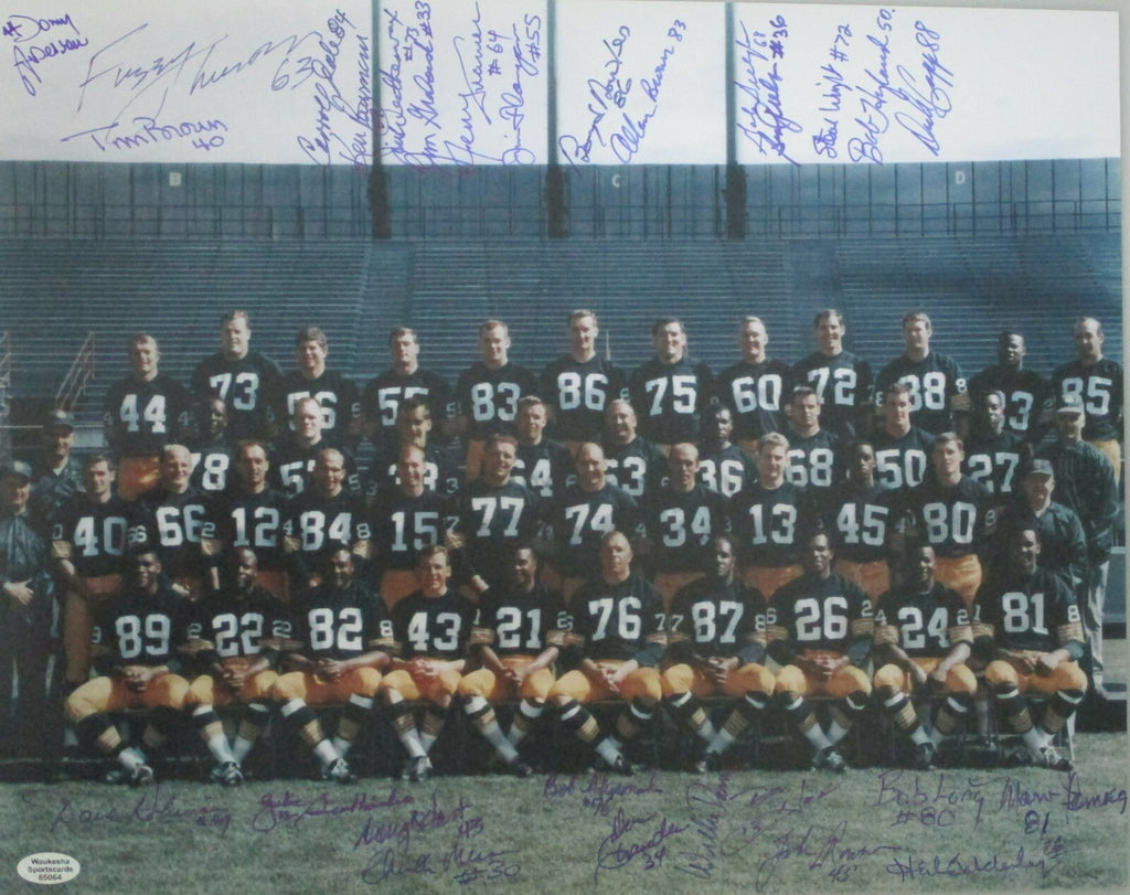 An 11x14 hand signed photo of the 1967 Super Bowl Championship Green Bay Packers 28 TOTAL SIGNATURES INCLUDING WILLIE DAVIS, BOB SKORONSKI, JERRY KRAMER, FUZZY THURSTON, DAVE ROBINSON, HERB ADDERLEY & MORE. The signatures are in blue sharpie. This would make a great addition to any Packer collection. This photo was signed at a public signing in our store. This item is guaranteed to be 100% authentic and will include a COA with matching serial numbered holograms.