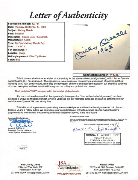 This Autographed w/ Robert F. Kennedy 11x14 Photo with the inscription of "1965" has been Personally Signed by Mickey Mantle of the New York Yankees. This item is 100% Authentic to include a Certificate of Authenticity (COA) / hologram by JSA. The authenticity can be verified on JSA website.