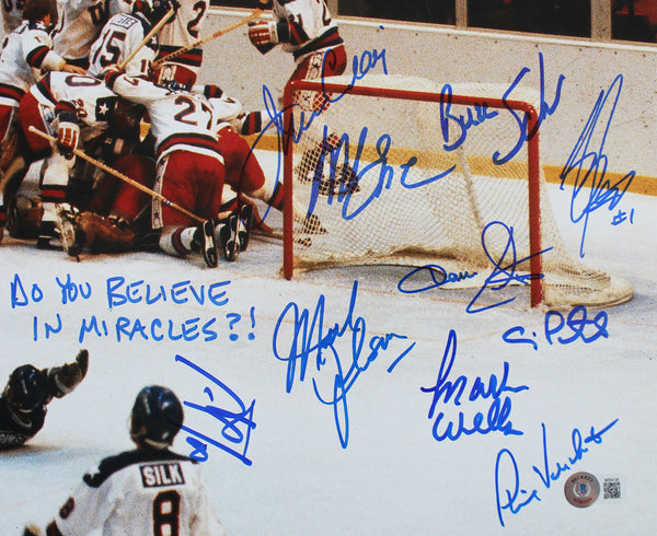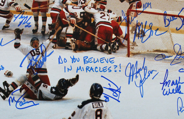 This Autographed 16x20 Photo with the inscription of "Do You Believe in Miracles?! (Harrington)" has been Personally Signed by Neal Broten, Dave Silk, Rob McClanahan & Mark Johnson, Steve Janaszak, Bill Baker, Dave Christian, Ken Morrow, Jack O'Callahan, Mike Ramsey, Steve Christoff, Mike Eruzione, Buzz Schneider, Eric Stroebel, Phil Verchota, Mark Wells, Craig Patrick, John Harrington & Jim Craig. This item is 100% Authentic to include a hologram by Beckett Authentication Services. This item will come with an affixed Beckett Authentication Services (BAS) authentication sticker, which includes a scannable QR code to verify authenticity. Please note that Beckett no longer provides serial-numbered COA cards, and the attached BAS sticker will serve as the complete authentication for this item. This is a BAS Witnessed Protection Program item which means a Beckett Authentication Service representative was present when this item was being signed. We conducted an autograph signing with Neal Broten, Dave Silk, Rob McClanahan & Mark Johnson, Steve Janaszak, Bill Baker, Dave Christian, Ken Morrow, Jack O'Callahan, Mike Ramsey, Steve Christoff, Mike Eruzione, Buzz Schneider, Eric Stroebel, Phil Verchota, Mark Wells, Craig Patrick, John Harrington & Jim Craig where multiples of the same item were signed. While the photographs are representative of this item, the size, placement and strength of the signature may vary. Each item is hand signed, therefore, each autograph is unique. This item can be verified through BAS Witnessed.