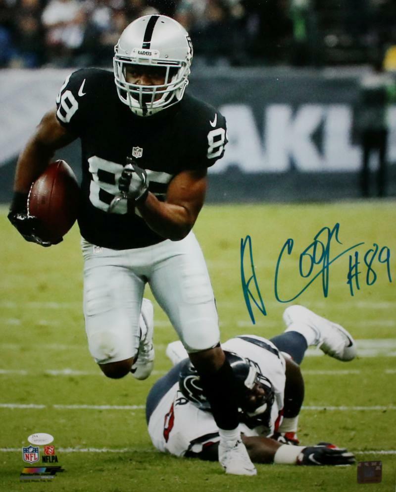Amari Cooper Autographed Raiders 16x20 Against Texans PF. Photo- JSA W Auth This is a Hand Autographed 16x20 Photo of Amari Cooper of The Oakland Raiders. This item has a James Spence Witness Protection Authentication, which comes with a JSA #'ed Sticker and a Matching JSA COA. You can view this item on the SpenceLOA website and it shows when and where the item was signed. It was signed either at a public autograph appearance or a private signing. This is a stock photo of the item. Although you may not receive this exact item, the item you receive is virtually identical and brand new in great shape.