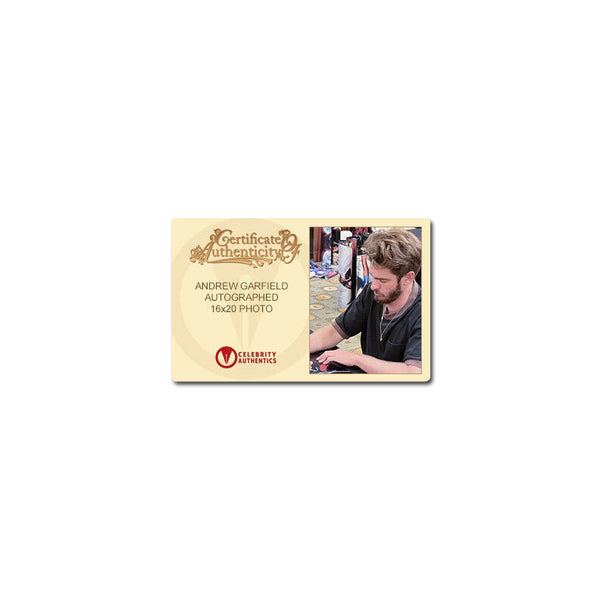 This 16x20 photo from The Amazing Spider-Man has been personally hand-signed by Spidey himself, Andrew Garfield during his signing with Celebrity Authentics. Ships affixed with Celebrity Authentics serial-numbered and tamper evident Authentication Hologram and includes Celebrity Authentics Certificate of Authenticity featuring picture of Andrew signing.Please note: with multiples signed by the actor, a sample photo is used from stock to represent what you will receive. Exact autograph size and placement may vary.