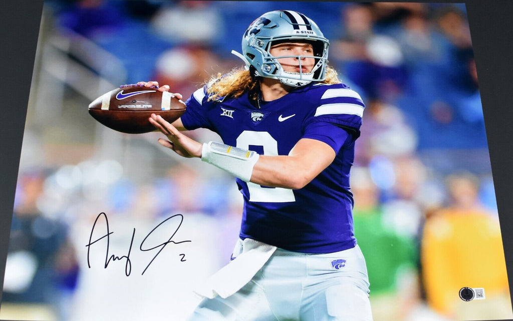 Avery Johnson, star quarterback for the Kansas State Wildcats, has hand signed this 16x20 photo at a private signing. This item is authenticated by Beckett Authentication Services and was signed in the presence of one of their representatives. Their tamper-evident hologram featuring a QR code and serial number is on the item. The authenticity can be verified online by entering the serial number or scanning the QR code.Item pictured may not be the exact item you will receive. It will be similar quality, and we guarantee your satisfaction.