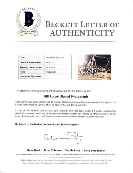 Bill Russell Autographed Boston Celtics 16x20 Photo LE 77/200 HOF Beckett 38796 The number in the listing title is just an inventory sku for our records and is not the authentication number. This is the exact item that you will receive so please see pictures for condition. This is a 16x20 photo that was personally autographed by Bill Russell with HOF inscription. Includes a certificate of authenticity from Beckett Authentication Services (BAS) and Denver Autographs.
