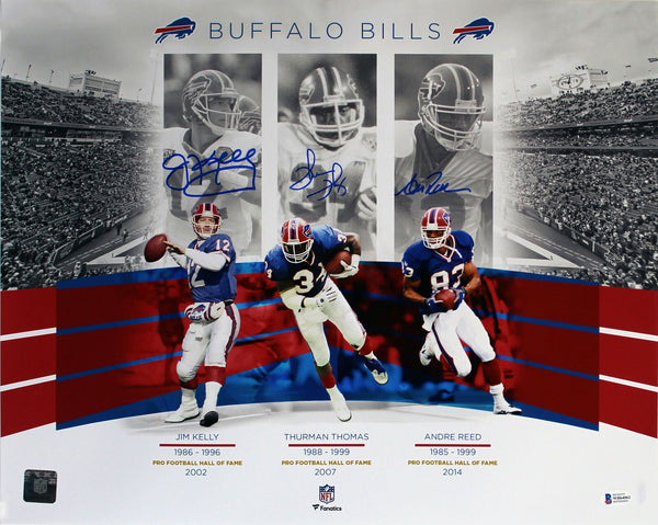 This Autographed 16x20 Photo has been Personally Signed by Jim Kelly, Thurman Thomas & Andre Reed of the Buffalo Bills. This item is 100% Authentic to include a Certificate of Authenticity (COA) / hologram by Beckett Authentication Services. This is a BAS Witnessed Protection Program item which means a Beckett Authentication Service representative was present when this item was being signed. This is a stock item. We conducted an autograph signing with Jim Kelly, Thurman Thomas & Andre Reed and we have several of these available. The one you will receive will be of equal quality to the one pictured. This item can be verified through BAS Witnessed.