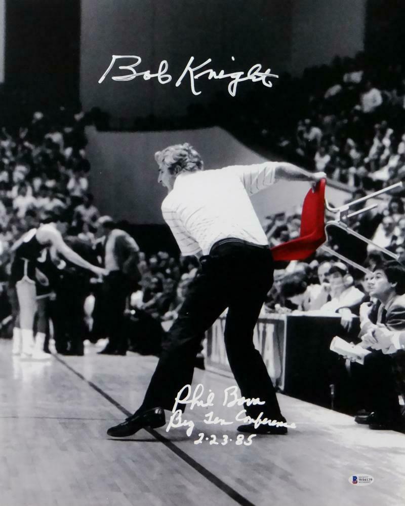 Bob Knight Phil Bova Signed 16x20 Red Chair Photo w/ Big Ten Beckett Auth *White This is a hand autographed 16x20 Photo of Bob Knight & Phil Bova. This item is inscribed with Big Ten Conference 2.23.85. This item has a Beckett Witness Authentication, which comes with a Beckett numbered and a matching Certificate of Authenticity. You can view this item on the Beckett Authentication website, it shows when and where the item was signed. It was signed either at a public autograph appearance or a private signing. This is a stock photo of the item. Although you may not receive this exact item, the item you receive is virtually identical and brand new in great shape.