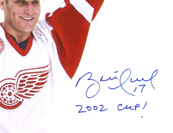 Photo measures 16" x 20" in size and has been hand-signed and inscribed by Brett Hull (Detroit Red Wings, HOF). The autograph includes an official Beckett Authentication Services serially numbered scannable hologram and QR Code card for authenticity purposes. The signing of this item was witnessed by Beckett.Authentication: Beckett Scannable Hologram with QR Code card