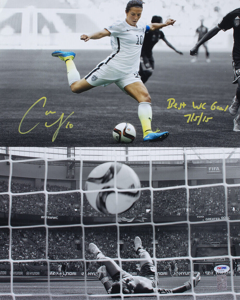 Featured is a Carli Lloyd signed 16x20 USA soccer photo in which she added the " Best WC Goal 7/5/15/ " inscription. This photo was hand signed by Carli Lloyd and authenticated by PSA/DNA authentication services. Included with the photo is a PSA/DNA hologram and certificate of authenticity. This item would make a great addition to any sports memorabilia collection!. SPECIFICATIONS Autographed By: Carli Lloyd Team: USA Sport: Soccer Authentication: PSA/DNA Authentication Services