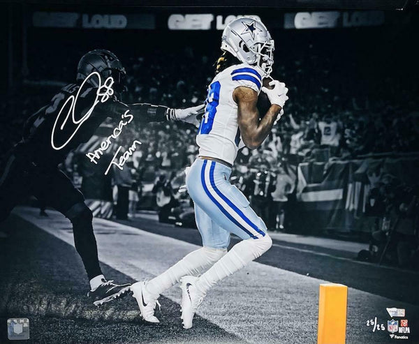 This 16" x 20" spotlight photograph has been personally hand-signed by CeeDee Lamb with the inscription "America's Team." It is officially licensed by the National Football League and comes with an individually numbered, tamper-evident hologram from Fanatics Authentic. To ensure authenticity, the hologram can be reviewed online. This process helps to ensure that the product purchased is authentic and eliminates any possibility of duplication or fraud.This photograph is limited to 25 and the winning bidder will receive number "25" from the edition.