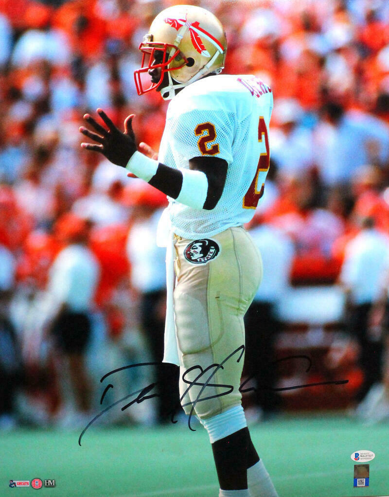 Deion Sanders Signed FSU Seminoles 16x20 White Jersey HM Photo- Beckett W *Black This is a hand autographed 16x20 Highland Mint Photo of Deion Sanders of the Florida State Seminoles. This item has a Beckett Witnessed Authentication, which comes with a numbered and a matching Certificate of Authenticity. You can view this item on the Beckett Authentication website and it shows when and where the item was signed. It was signed either at a public autograph appearance or a private signing. This is a stock photo of the item. Although you may not receive this exact item, the item you receive is virtually identical and brand new in great shape.