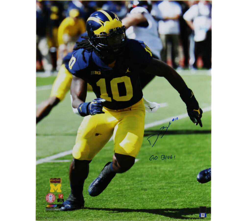 A Michigan Wolverines 16x20 Photo - Running- hand signed by Devin Bush. The item and signature are in excellent condition. In addition to signing his name, Devin also inscribed "Go Blue" on the item. Devin Bush was a Linebacker for the University of Michigan. He was Big Ten Defensive Player of the Year (2018), Big Ten Linebacker of the Year (2018), Consensus All-American (2018), Second-team All-American (2017), & 2x First-team All-Big Ten (2017, 2018). AUTHENTICATION: The item is accompanied by a Certificate of Authenticity - Serial Numbered and Databased Hologram - Picture of Devin from the Signing