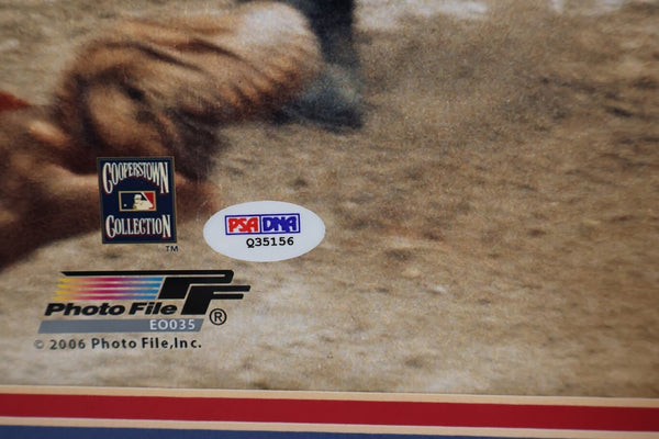 Ernie Banks Autographed 16x20 Photo with Matte - PSA COA - Framed as is Iconic 16x20 action photo of Cubs legend Ernie Banks, hand-signed with "H.O.F. 77" inscription. Professionally matted in Cubs colors with nameplate and authenticated by PSA. A bold tribute to "Mr. Cub" and one of baseball's all-time greats. Framed as is - ready to display!