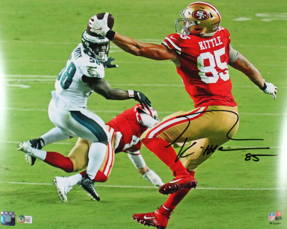 George Kittle Autographed San Francisco 49ers 16x20 One Hand Catch Photo- Beckett W Hologram *Black This is a George Kittle of the San Francisco 49ers hand autographed 16x20 photo This item has a Beckett Witnessed Authentication, which comes with a numbered hologram and a QR code for verification. Fanatic Photo. You can view this item on the Beckett website, it shows when and where the item was signed. It was signed either at a public autograph appearance or a private signing. This is a stock photo of the item. Although you may not receive this exact item, the item you receive is virtually identical, brand new, and in great shape.