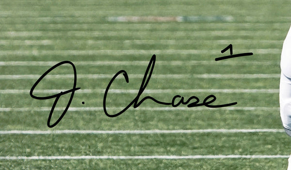 This is a 16x20 Photo that has been hand signed by Ja'Marr Chase. This item has been witnessed and certified authentic by Beckett Authentication (BAS) and comes with their tamper-proof witness sticker.