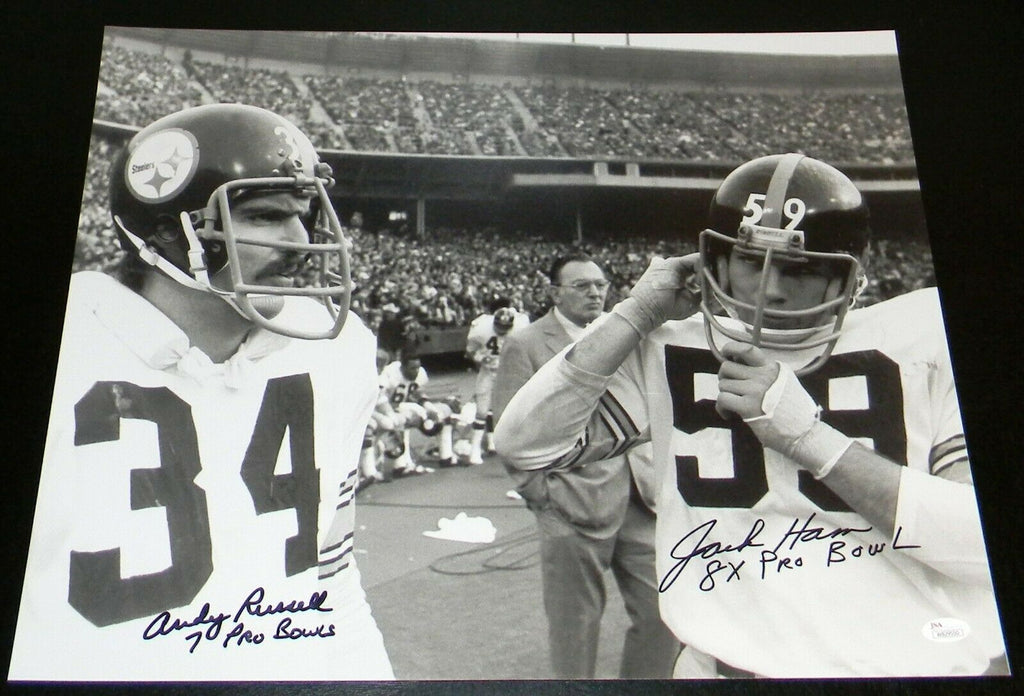 Jack Ham and Andy Russell, former Pro Bowlers for the Pittsburgh Steelers, have each hand signed this 16x20 photo at a private signing. This item comes with a certificate of authenticity (COA) from JSA - James Spence Authentication and was signed in the presence of one of their representatives. You will receive a serial-numbered COA along with a matching serial-numbered sticker on the photo. The authenticity can be verified online by entering the serial number.Item pictured may not be the exact item you will receive. It will be similar quality, and we guarantee your satisfaction.