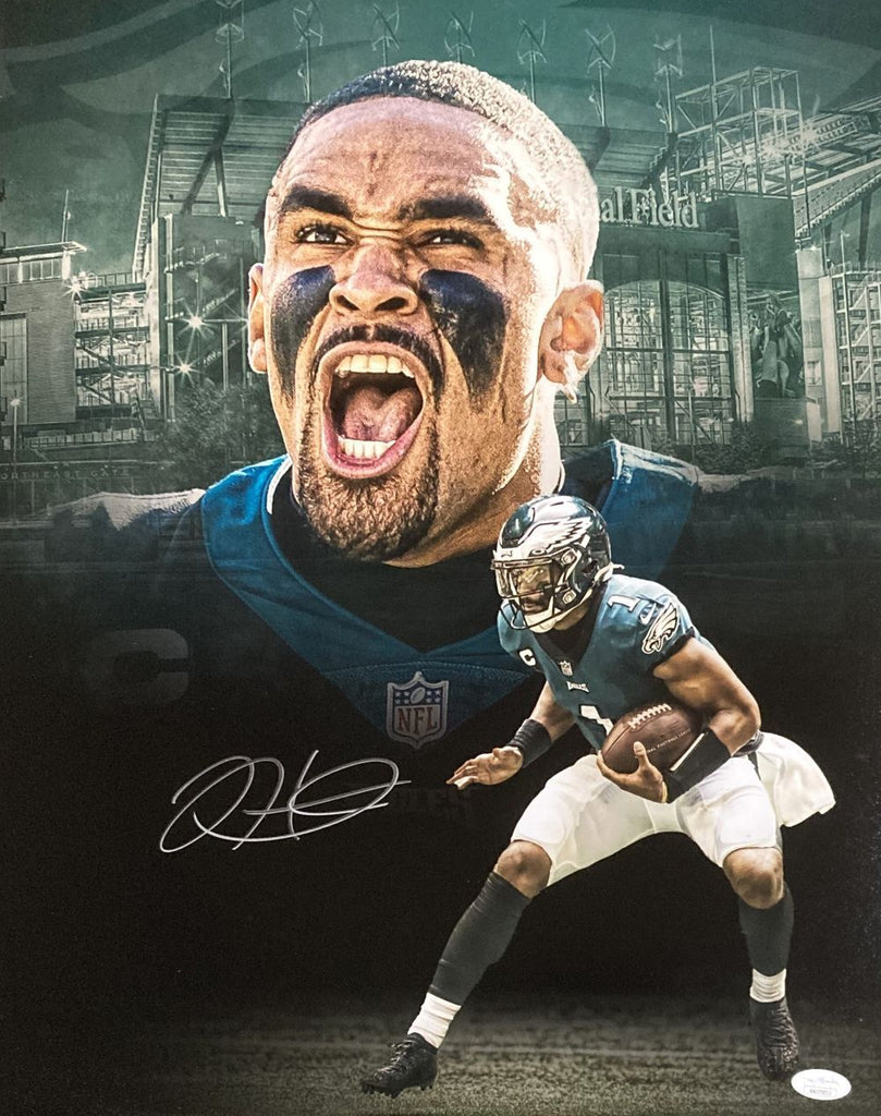 Featured is a Jalen Hurts signed 16x20 Philadelphia Eagles photo. This photo was hand signed by Hurts and comes with the JSA Witnessed hologram and certificate of authenticity. This photo would make a great addition to any sports memorabilia collection!. SPECIFICATIONS Autographed By: Jalen Hurts Team: Philadelphia Eagles Sport: Football Authentication: James Spence Authentication (JSA)