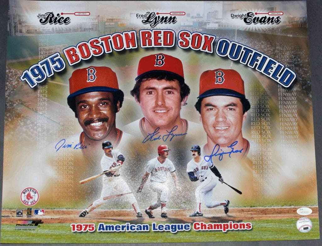 Jim Rice, Fred Lynn and Dwight Evans, the famous outfield for the 1975 Boston Red Sox, have each hand signed this 16x20 photo. This item comes with a certificate of authenticity (COA) from JSA - James Spence Authentication and was signed in the presence of one of their representatives. You will receive a serial-numbered COA along with a matching serial-numbered sticker on the photo. The authenticity can be verified online by entering the serial number.Item pictured may not be the exact item you will receive. It will be similar quality, and we guarantee your satisfaction.