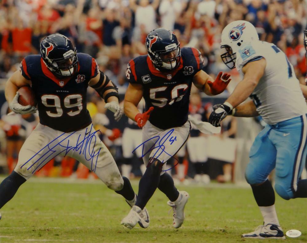 This is a hand autographed 16x20 Photo of Justin James JJ Watt and Brian Cushing of The Houston Texans. This item has a James Spence Witness Protection Authentication, which comes with a JSA numbered sticker and a matching JSA COA. You can view this item on the SpenceLOA website and it shows when and where the item was signed. It was signed either at a public autograph appearance or a Private Signing. This is a stock photo of the item. Although you may not receive this exact item, the item you receive is virtually identical and brand new in great shape. This is a hand autographed 16x20 Photo of Justin James JJ Watt and Brian Cushing of The Houston Texans. This item has a James Spence Witness Protection Authentication, which comes with a JSA numbered sticker and a matching JSA COA. You can view this item on the SpenceLOA website and it shows when and where the item was signed. It was signed either at a public autograph appearance or a Private Signing. This is a stock photo of the item. Although you may not receive this exact item, the item you receive is virtually identical and brand new in great shape.