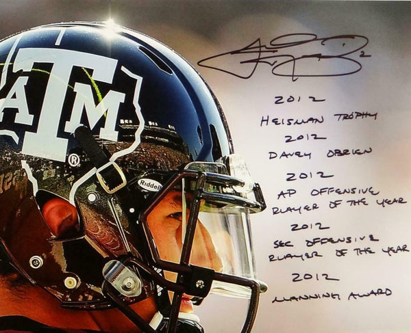 Johnny Manziel Signed Texas A&M 16x20 Close Up PF Photo w/ Stats- Beckett Auth This is a hand autographed 16x20 Photo File Photo of Johnny Manziel of the Texas A&M Aggies. This item has a Beckett Authentication, which comes with a Beckett numbered and a matching Beckett Certificate of Authenticity. You can view this item on the Beckett Authentication website, it shows when and where the item was signed. It was signed either at a public autograph appearance or a private signing. This is a stock photo of the item. Although you may not receive this exact item, the item you receive is virtually identical and brand new in great shape.
