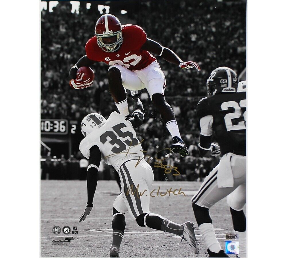 An Alabama Crimson Tide Unframed 16x20 NCAA Photo - Leaping hand signed by Kevin Norwood. The item and signature are in excellent condition. In addition to signing his name, Kevin also inscribed "Mr. Clutch" on the item. Kevin is a 3x National Champ & 2x SEC Champ. AUTHENTICATION: The item is accompanied by a Certificate of Authenticity - Kevin Norwood Exclusive Serial Numbered and Databased Hologram - Picture of Kevin from the Signing