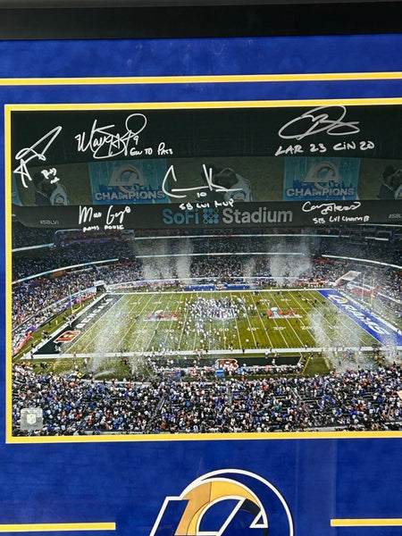 Ultra-Rare Super Bowl LVI Championship Masterpiece Own the ultimate piece of Los Angeles Rams history with this 16x20 Super Bowl LVI celebration photo featuring six authentic signatures from the championship team's biggest stars. This museum-quality collectible is #1 of only 56 ever produced, making it one of the rarest and most valuable pieces of Rams memorabilia in existence. Six Championship Signatures Matt Stafford - Super Bowl LVI Champion Quarterback Cooper Kupp - Super Bowl LVI MVP & Offensive Player of the Year Aaron Donald - NFL Defensive Player of the Year & Future Hall of Famer Cam Akers - Dynamic Running Back Odell Beckham Jr. - Star Wide Receiver Matt Gay - Clutch Kicker Extreme Rarity & Investment Value This is #1 of only 56 pieces in this limited edition - a number chosen to commemorate Super Bowl LVI (56). As the first piece in this exclusive collection, it carries exceptional collector value and investment potential. Each signature is authenticated by Fanatics, the official memorabilia partner of the NFL. Championship Moment Captured This stunning 16x20 photo captures the pure joy and celebration of the Rams' Super Bowl LVI victory at SoFi Stadium, where they defeated the Cincinnati Bengals 23-20 to bring the Lombardi Trophy home to Los Angeles for the first time since 1999. Perfect For: Serious LA Rams collectors seeking the ultimate centerpiece Investment-grade sports memorabilia portfolios Once-in-a-lifetime gift for the ultimate Rams fan Museum-quality display in home, office, or man cave Complete with Fanatics Certificate of Authenticity guaranteeing all six signatures, this is a trophy piece that will be treasured for generations and appreciate significantly in value.