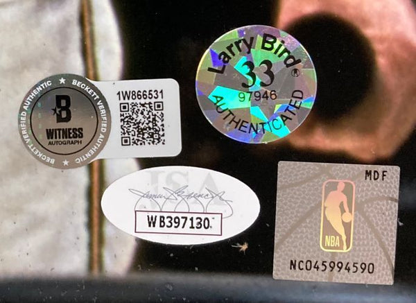 Featured is a Larry Bird and Magic Johnson signed 16x20 photo. This photo has been hand signed by Bird and Johnson and comes with the Beckett and JSA witnessed holograms and certificates of authenticity, along with the Bird exclusive hologram. This photo would make a great addition to any sports memorabilia collection!. SPECIFICATIONS Autographed By: Team: Boston Celtics Sport: Basketball Authentication: James Spence Authentication (JSA)