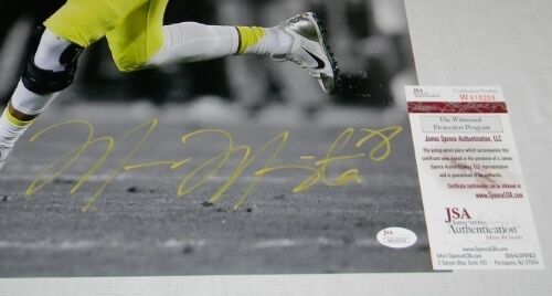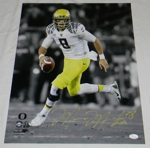 Marcus Mariota, former Heisman Trophy winning quarterback for the Oregon Ducks, has hand signed this 16x20 photo at a private signing. This item comes with a certificate of authenticity (COA) from JSA - James Spence Authentication and was signed in the presence of one of their representatives. You will receive a serial-numbered COA along with a matching serial-numbered sticker on the photo. The authenticity can be verified online by entering the serial number.Item pictured may not be the exact item you will receive. It will be similar quality, and we guarantee your satisfaction.
