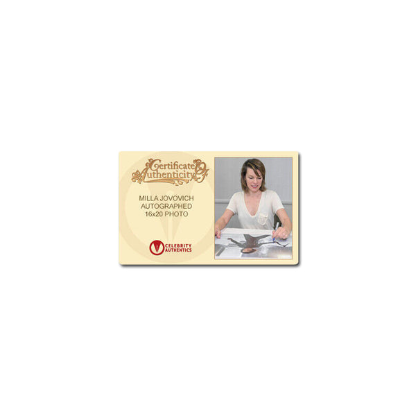 Celebrity Authentics is the exclusive autograph partner of Milla Jovovich. Please be aware most other online autographs purported to be Ms. Jovovich's are forgeries. Ms. Jovovich has only signed with Celebrity Authentics so be sure the item you choose is affixed with the Celebrity Authentics Authentication Hologram for her genuine signature.This 2012 Resident Evil: Retribution 16x20 Action Photo of Milla Jovovich as Alice has been personally autographed by Milla during her exclusive signing with Celebrity Authentics. As Umbrella Corp.'s deadly T-virus continues to turn the world's population into legions of flesh-eating zombies, Alice (Milla Jovovich), the human race's last hope, awakes deep within Umbrella's secret operations facility. The further she delves into the complex, the more of her mysterious past is unveiled. Her global hunt for those responsible for the outbreak leads to a mind-blowing revelation; Aided by friends old and new, Alice fights to escape from a world on the edge of oblivion. Great closeup image ships affixed with Celebrity Authentics serial-numbered Authentication hologram and includes Celebrity Authentics Certificate of Authenticity featuring picture of Milla signing photo.Please note: with multiples signed by the actor, a sample photo is used from stock to represent what you will receive. Exact autograph size and placement may vary.