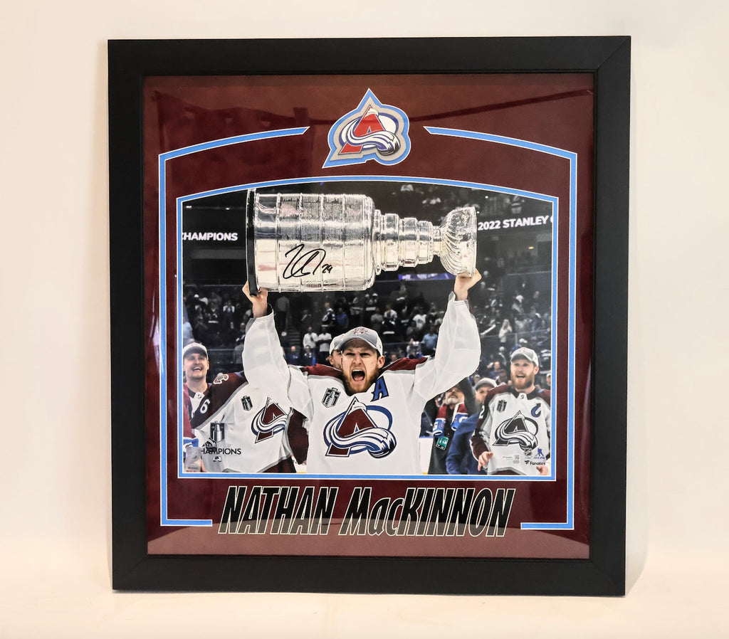 Nathan MacKinnon Stanley Cup Champion Autographed 16x20 Photo with Deluxe Burgundy Background Frame MacKinnon holding Stanley Cup Trophy Fanatics Authenticated