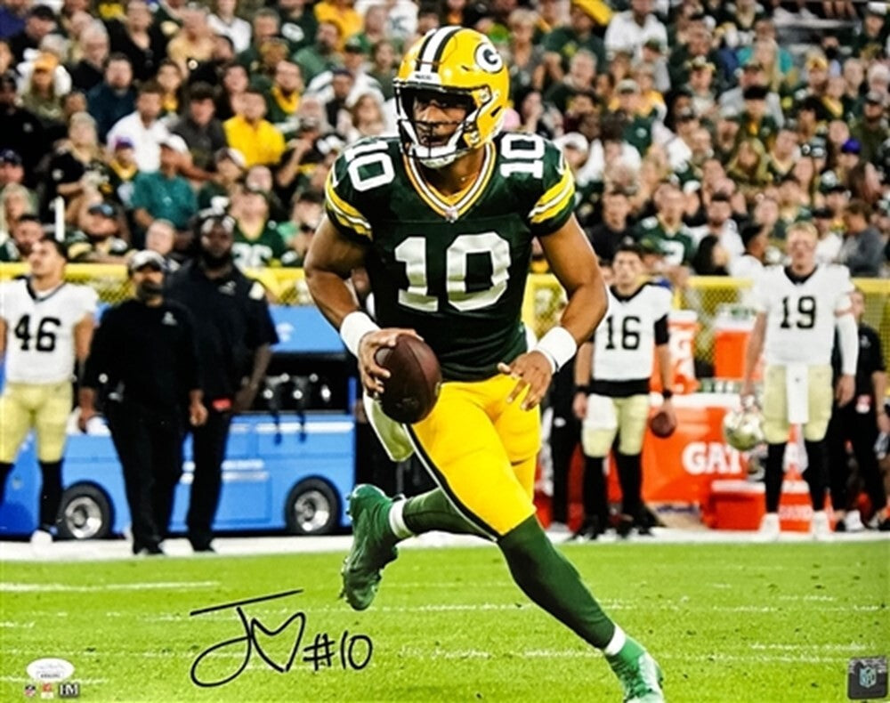 A 16x20 hand signed color photo of Green Bay Packers Quarterback JORDAN LOVE. The signature is in Black paint pen. This would make a great addition to any Packers collection. This item was signed at a private signing with us. This item is guaranteed to be 100% authentic and will include a COA Serial numbered hologram from JSA (James Spence Authentication) authentication.