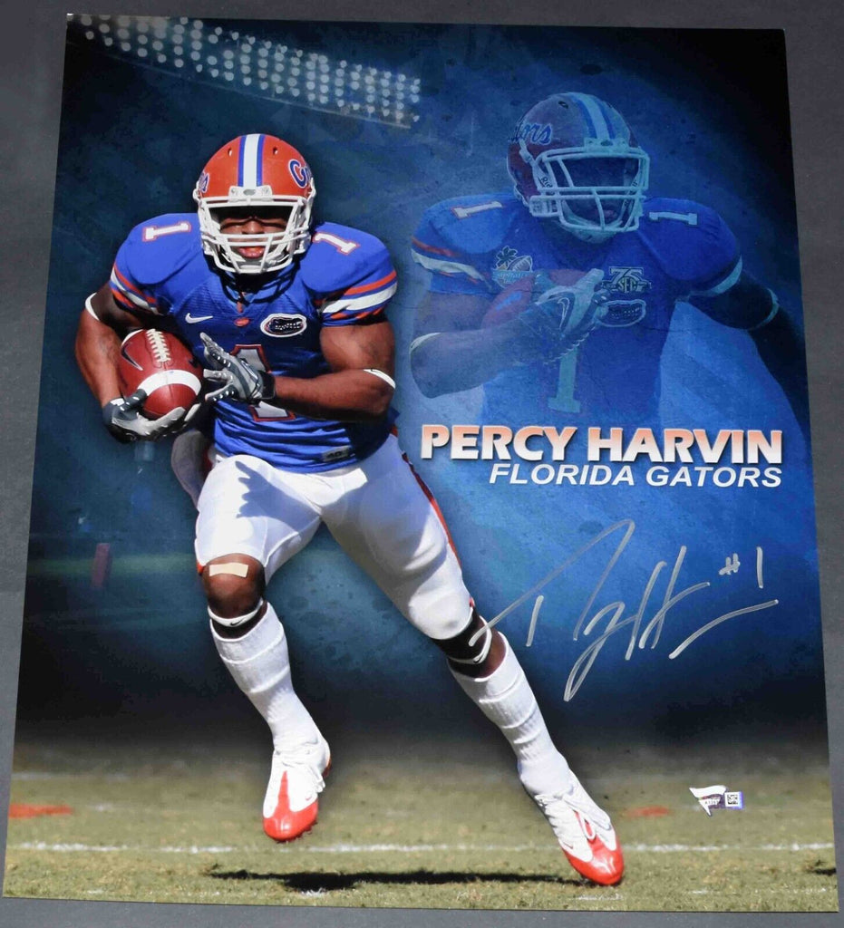 Percy Harvin, former All-American for the Florida Gators, has hand signed this 16x20 photo at a private signing. This item comes with a serial-numbered hologram from Fanatics Authentic, one of the leaders in the industry. The authenticity can be verified online by entering the serial-number. A Fanatics Authentic information card is also included.Item pictured may not be the exact item you will receive. It will be similar quality, and we guarantee your satisfaction.
