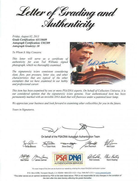 This RED SOX TED WILLIAMS SIGNED 16X20 PHOTO AUTO GRADED PERFECT 10! PSA/DNA #U01309 has been certified authentic. It will include the PSA/DNA numbered hologram and matching Certificate of Authenticity.