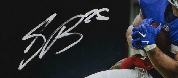 It's no surprise that Saquon Barkley is one of the hardest running backs to tackle in the NFL. With a strong base and shifty moves, Saquon can make bigger defenders miss with a simple juke move or he can run over the smaller defensive backs and drag them along for extra yards. Barkley made defenders miss all year long as he gathered over 2000 yards from scrimmage, scored 15 total touchdowns, and earned himself both Offensive Rookie of the Year and 1st Team All-Pro Honors. Celebrate Saquon Barkley's impressive rookie season with this framed 16x20 autographed photo as he breaks a tackle and sets his eyes on the next level of defense.This autographed photo includes a Panini Authentic certificate of authenticity with a unique hologram number that corresponds to the hologram on the actual collectible. These holograms protect the integrity of the product and serve to guarantee the authenticity of the signature it bears.This photograph is limited to 126 and you are bidding on a random number from the edition.