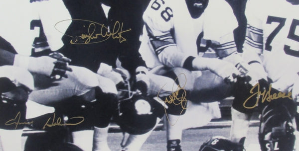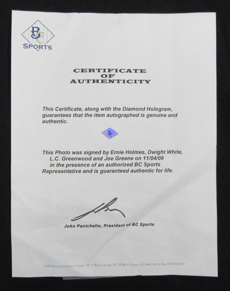 The legendary Steel Curtain quartet--Joe Greene, Dwight White, Ernie Holmes, and L.C. Greenwood of the Pittsburgh Steelers signed 16" x 20" photograph. Professionally framed, the piece measures 26.5" x 22.5" overall. Authenticated by BC Sports, this collectible captures the iconic defensive line that defined an era.